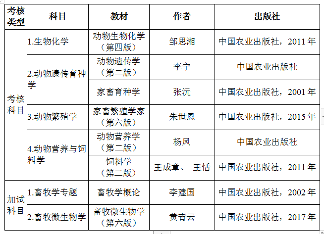学科方向课程为动物育种学或动物繁殖学或动物营养与饲料学(试卷满分100分,考试为闭卷考试,考试时间2个小时),该课程考试成绩计入申请人的总成绩,占总成绩的10%;考试时间:2020年5月17日下午。考试地点:做爱动画 畜产楼。