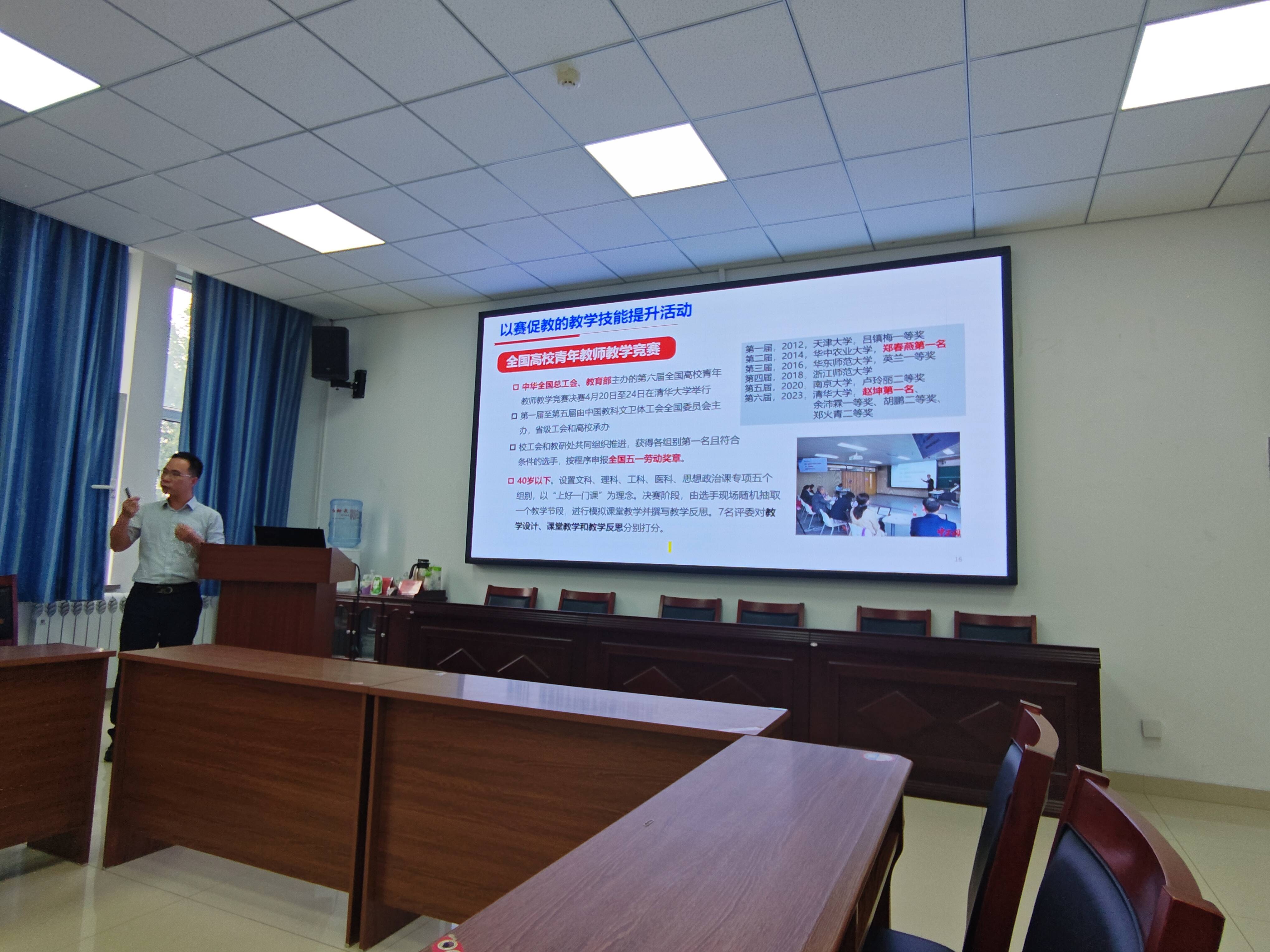 郑火青教授通过“以赛促教的教学技能提升活动”和“关于教学技能提升的几点思考”就教学竞赛进行汇报。关于教学技能提升的几点思考主要从“金课”建设:高阶性、创新性、挑战度;以学生成长为中心的教育教学理念;科教融合拓展知识外延(专业课教学:教学和科研互融共促);以师生互动为基调的教学过程;润物细无声的思政融合(塑造人格);响应育人使命的时间投入;合适的竞赛用教学主题等几个方面进行了分享交流。