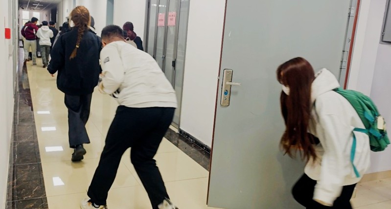 艾孜买提·许合热提为大家仔细讲解了火灾逃生技巧并组织观看宿舍逃生视频。从弯腰低姿的前行姿势,到用湿毛巾捂住口鼻的细致动作,再到按照疏散指示标志有序撤离的重要原则,讲解面面俱到、细致入微。同学们在老师的镇定指挥下,迅速而有序地按照预定的逃生路线进行撤离。大家用手或毛巾捂住口鼻,压低身体重心,快速朝着安全出口疏散。整个逃生过程紧张而有序,没有出现混乱和恐慌的局面。